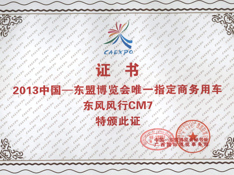 获奖名称:东风风行CM7为2013年中国东盟博览会唯一指定商务用车